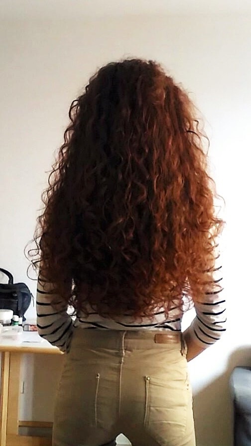 Mes cheveux semblent plus courts après la coupe mais la longueur est strictement la même, seulement mon pantalon est taille haute sur la première et taille basse sur la seconde, les deux ne sont pas prises du même angle, et mes boucles sont plus détendues sur la première ! J’ai coupé environ 15cm sur la queue de cheval, j’obtiens donc un dégradé d’une quinzaine de centimètres entre les mèches du contour du visage et celles du dos, qui elles demeurent totalement intactes (je n’ai pas coupé assez haut pour les atteindre). J’ai coupé assez peu donc le dégradé est plutôt léger, pour un premier essai je trouvais ça plus raisonnable. La prochaine fois, je n’hésiterai probablement pas à couper un peu plus pour accentuer le dégradé.